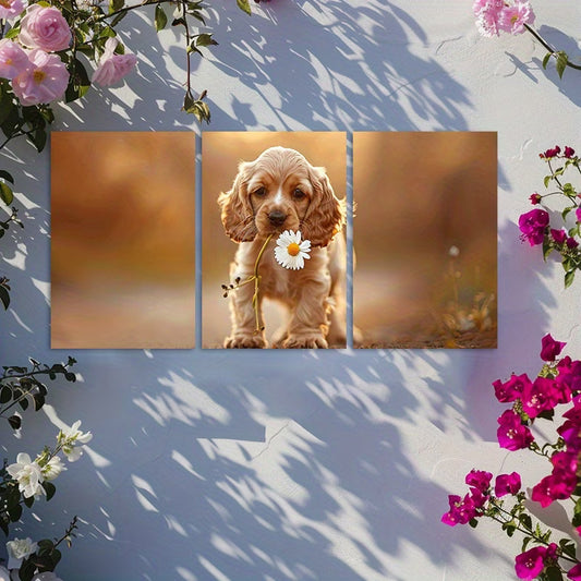 3pcs Roosterer Spaniel Puppy with Floral Wall Art Set Canvas Framed 50x70cm - High Quality Print 100% Australian Made Wall Canvas Ready to Hang