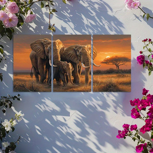 3pcs Elephants on the Grassland Warm Scene Wall Art Set Canvas Framed 50x70cm - High Quality Print 100% Australian Made Wall Canvas Ready to Hang