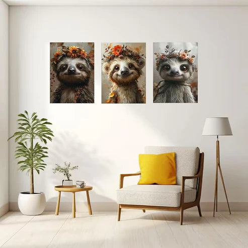 3pcs Cute Autumn Sloth Flower Crown Wall Art Set Canvas Framed 50x70cm - High Quality Print 100% Australian Made Wall Canvas Ready to Hang