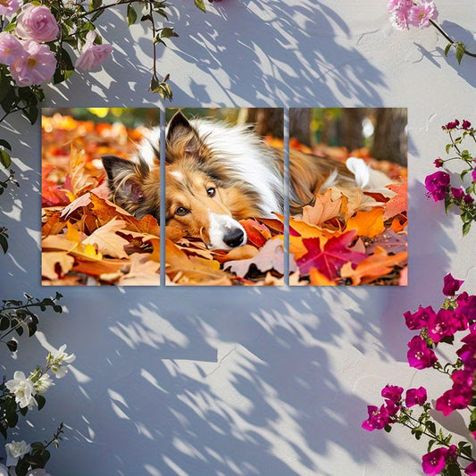3pcs Shetland Sheepdog in Autumn Leaves Wall Art Set Canvas Framed 50x70cm - High Quality Print 100% Australian Made Wall Canvas Ready to Hang