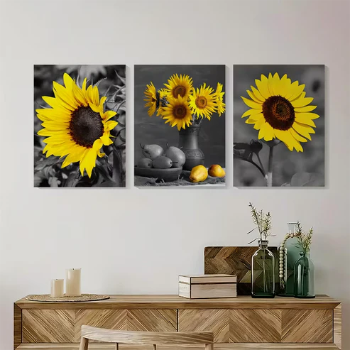 3pcs Sunflower Yellow Floral Painting Wall Art Set Canvas Framed 50x70cm - High Quality Print 100% Australian Made Wall Canvas Ready to Hang