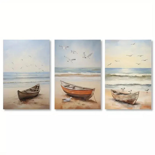 3pcs Beach Boat Wall Art Set Canvas Framed 50x70cm - High Quality Print 100% Australian Made Wall Canvas Ready to Hang