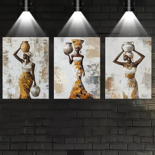 3pcs Elegant African Women with Vase on a table Wall Art Set Canvas Framed 50x70cm - High Quality Print 100% Australian Made Wall Canvas Ready to Hang