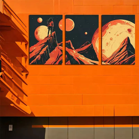 3pcs Woman Over Jagged Mountains Under Planets Wall Art Set Canvas Framed 50x70cm - High Quality Print 100% Australian Made Wall Canvas Ready to Hang
