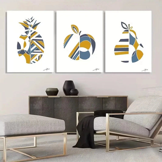 3pcs Mustard Yellow and Blue Geometric Fruit Wall Art Set Canvas Framed 60x90cm - High Quality Print 100% Australian Made Wall Canvas Ready to Hang