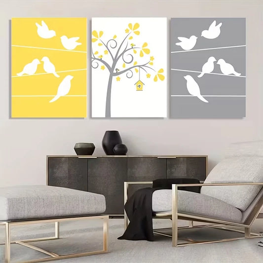 3pcs Bird and Tree Modern Yellow Grey Nursery Wall Art Set Canvas Framed 60x90cm - High Quality Print 100% Australian Made Wall Canvas Ready to Hang
