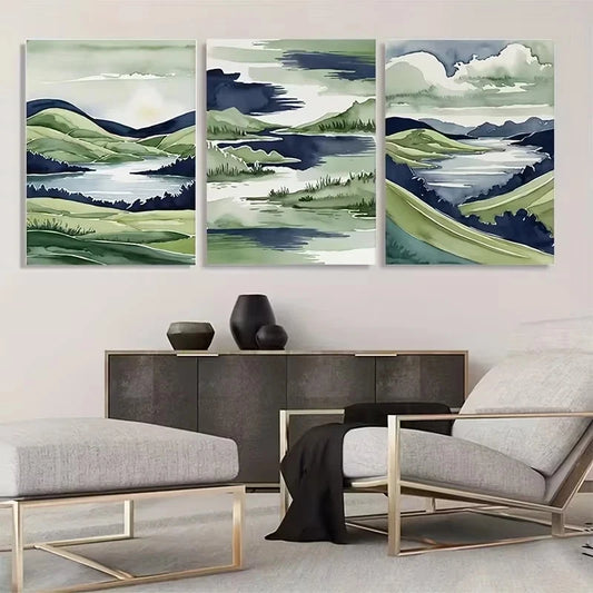 3pcs Blue and Green Abstract Landscape Wall Art Set Canvas Framed 60x90cm - High Quality Print 100% Australian Made Wall Canvas Ready to Hang