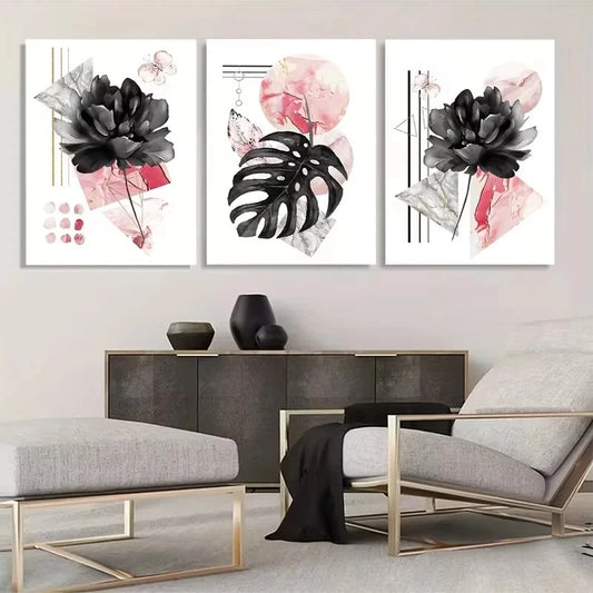 3pcs Pink, Gray, Black Abstract Floral Wall Art Set Canvas Framed 60x90cm - High Quality Print 100% Australian Made Wall Canvas Ready to Hang