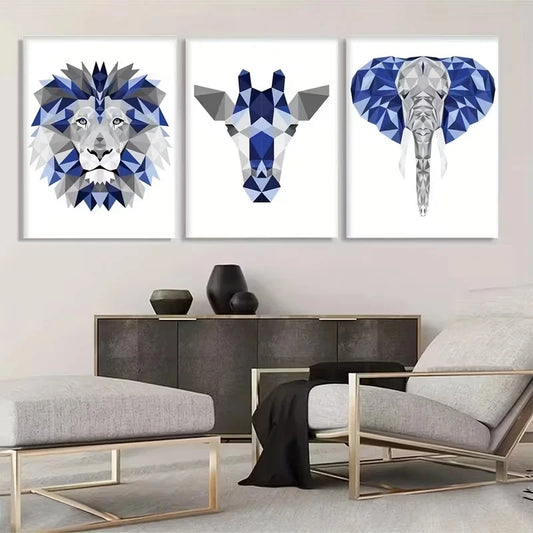 3pcs Navy Blue and Gray Giraffe Lion Elephant Wall Art Set Canvas Framed 60x90cm - High Quality Print 100% Australian Made Wall Canvas Ready to Hang