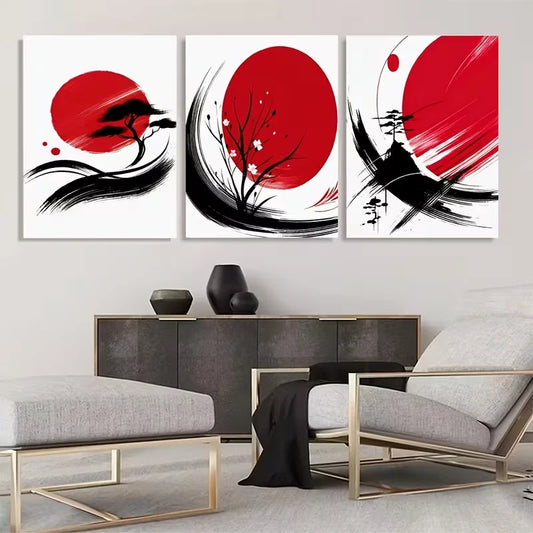 3pcs Three Sets of Japanese Ink Painting Red Wall Art Set Canvas Framed 60x90cm - High Quality Print 100% Australian Made Wall Canvas Ready to Hang