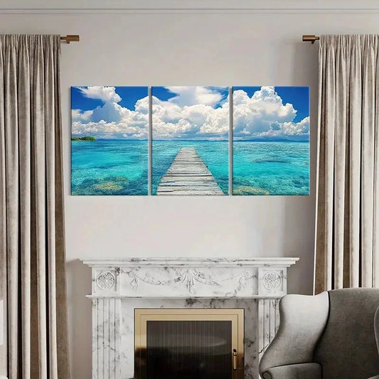 3pcs Beach Pier Ocean Seagull Waves Scene Wall Art Set Canvas Framed 60x90cm - High Quality Print 100% Australian Made Wall Canvas Ready to Hang
