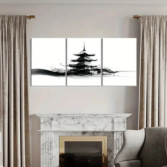 3pcs Black & White Abstract Pagoda Ink Painting Wall Art Set Canvas Framed 60x90cm - High Quality Print 100% Australian Made Wall Canvas Ready to Hang