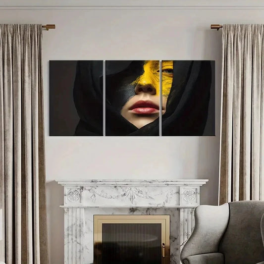 3pcs Modern Decor Yellow Black Face Red Lips Wall Art Set Canvas Framed 60x90cm - High Quality Print 100% Australian Made Wall Canvas Ready to Hang