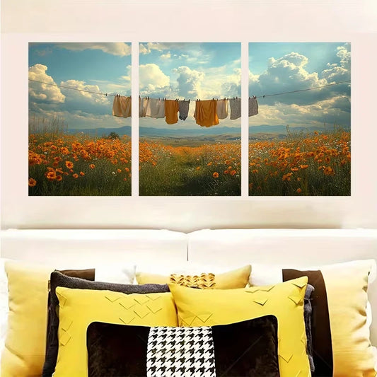 3pcs Rustic Clothesline Field Landscape w Wall Art Set Canvas Framed 60x90cm - High Quality Print 100% Australian Made Wall Canvas Ready to Hang