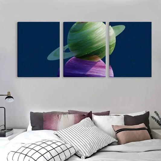3pcs Green Ringed Planet Rests On Purple Sphere Wall Art Set Canvas Framed 60x90cm - High Quality Print 100% Australian Made Wall Canvas Ready to Hang