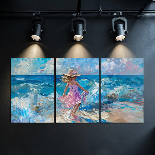 3pcs Girl in Pink Running on The Beach Wall Art Set Canvas Framed 40x60cm - High Quality Print 100% Australian Made Wall Canvas Ready to Hang