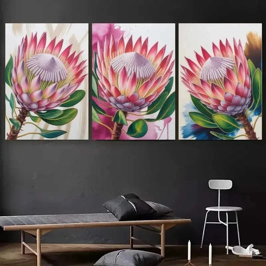 3pcs Protea Flower, Green Leaves Wall Art Set Canvas Framed 40x60cm - High Quality Print 100% Australian Made Wall Canvas Ready to Hang