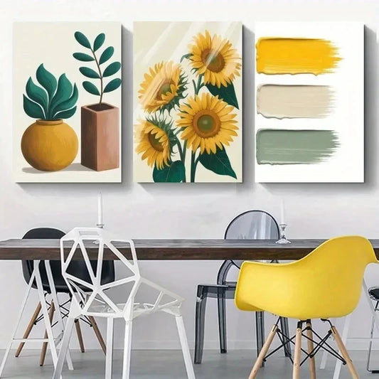 3pcs Sunflower, Green Leaves, Potted Wall Art Set Canvas Framed 40x60cm - High Quality Print 100% Australian Made Wall Canvas Ready to Hang