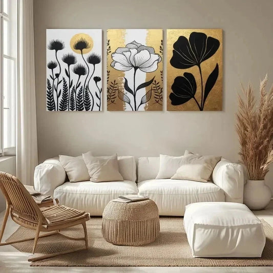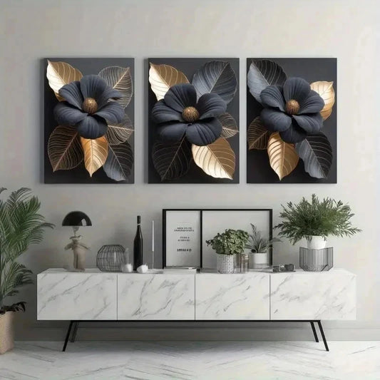 3pcs Black & Golden Floral Canvas Wall Art Set Canvas Framed 40x60cm - High Quality Print 100% Australian Made Wall Canvas Ready to Hang