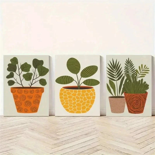 3pcs Green Leaves in Orange, Yellow & Brown Pot Wall Art Set Canvas Framed 40x60cm - High Quality Print 100% Australian Made Wall Canvas Ready to Hang