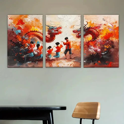 3pcs Spring Festival Dragon Dance Wall Art Set Canvas Unframed - High Quality Print 100% Australian Made Wall Canvas