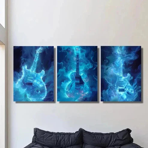 3pcs Guitars with Blue Flames Decoration Wall Art Canvas Unframed - High Quality Print 100% Australian Made Wall Canvas