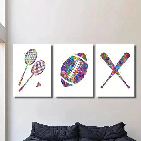 3pcs Rainbow Badminton Football Baseball Wall Art Canvas Unframed - High Quality Print 100% Australian Made Wall Canvas