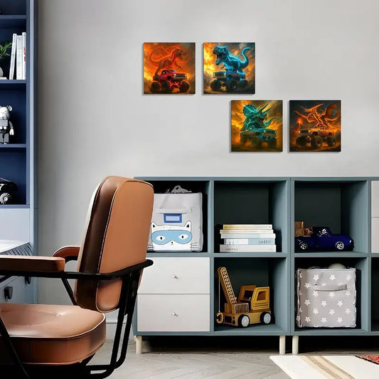 4pcs Vibrant Dinosaur Truck Wall Art Canvas Framed