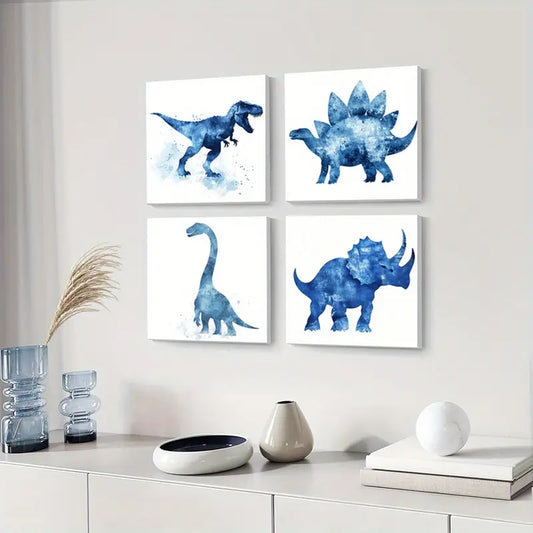 4pcs Dinosaurs Blue Tones Paint Wall Art Canvas Framed