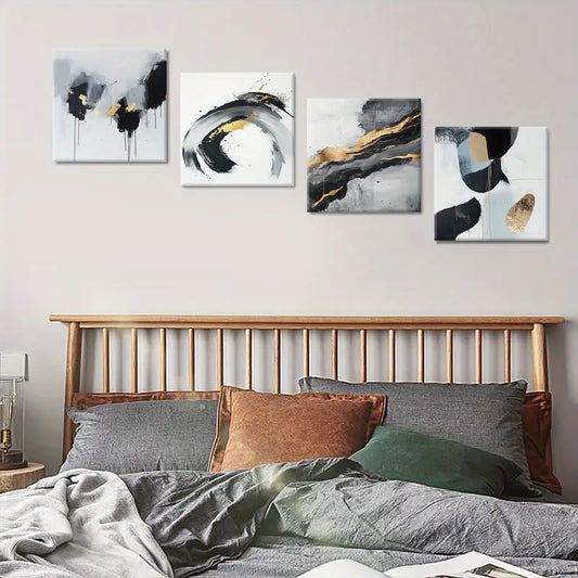 4pcs Black , Gold and White Paint Wall Art Canvas Framed
