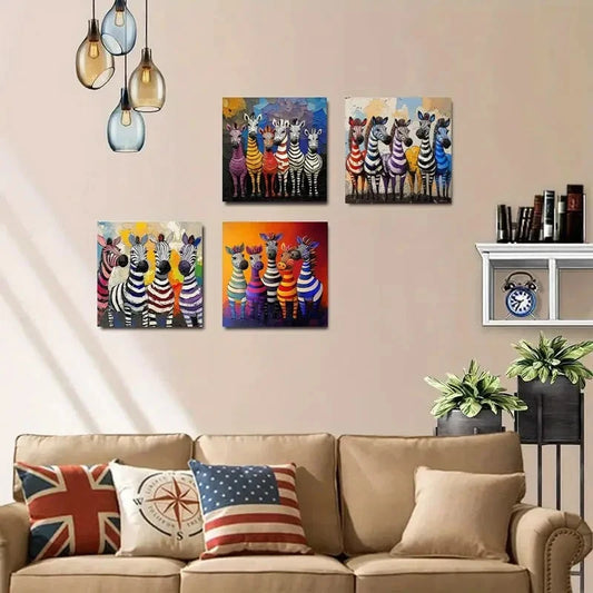4pcs Vintage Abstract Colorful Zebra Wall Art Canvas Framed