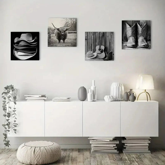 4pcs Highland Cow Print Boots Straw Hat Wall Art Canvas Framed