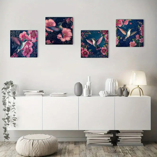 4pcs Hummingbirds & Flowers Wall Art Canvas Framed