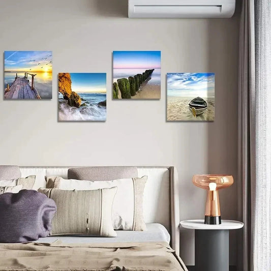 4pcs Teal Blue Beach Scenery Wall Art Canvas Framed