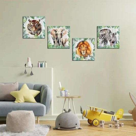 4pcs Tiger, Lion, Elephant & Zebra Wall Art Canvas Framed