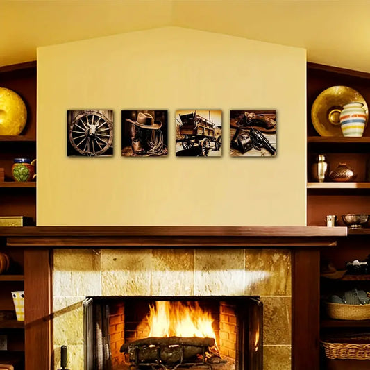4pcs Cowboy Hat Boot Saddle Faux LeatherWall Art Canvas Framed
