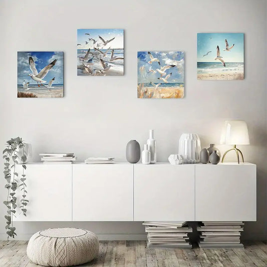 4pcs Ocean Beach Abstract Seaside Seagull Seasca Wall Art Canvas Framed