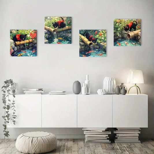 4pcs Black Lucky Cat Canvas Art Prints Wall Art Canvas Framed