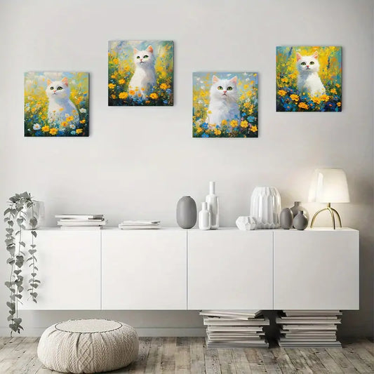4pcs Flower White Cat Poster Fun Cat Wall Art Canvas Framed