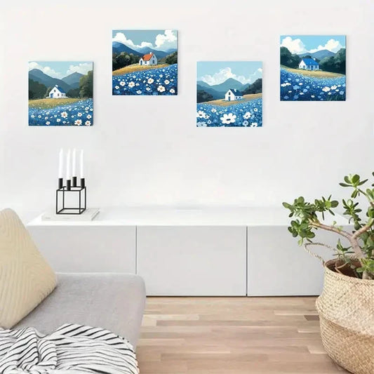 4pcsVibrant Bluebells & CottageWall Art Canvas Framed