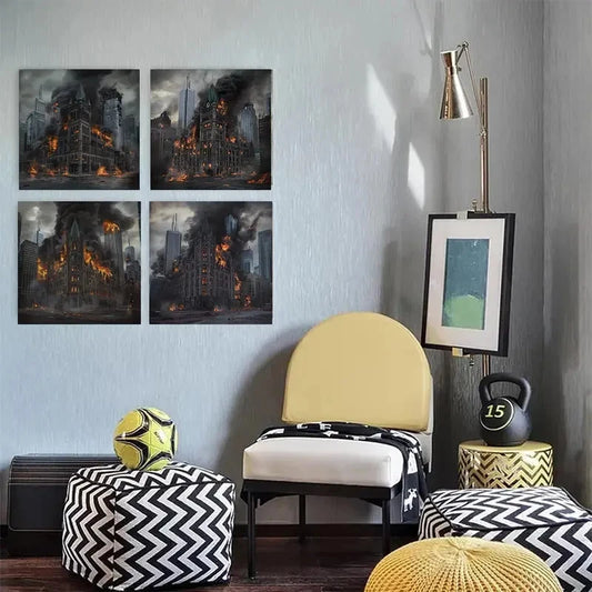 4pcs Fire-Ravaged Cityscape with DramaticWall Art Canvas Framed