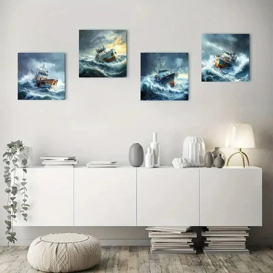 4pcs Dramatic Fishing Boat BattlingWall Art Canvas Framed