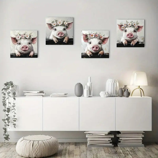 4pcs Adorable Pig Modern Flower Crown Design Wall Art Canvas Framed