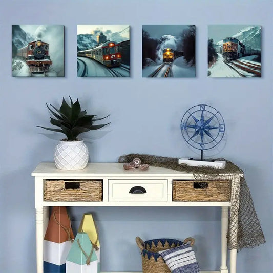 4pcs Snowy Mountain Train ScenesWall Art Canvas Framed