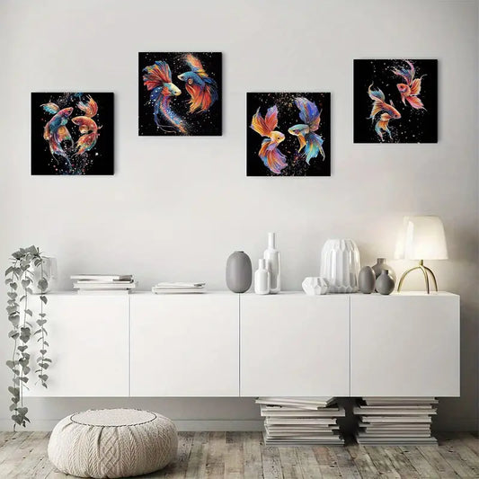4pcs Betta Fish Design With Sparkling Stars Wall Art Canvas Framed
