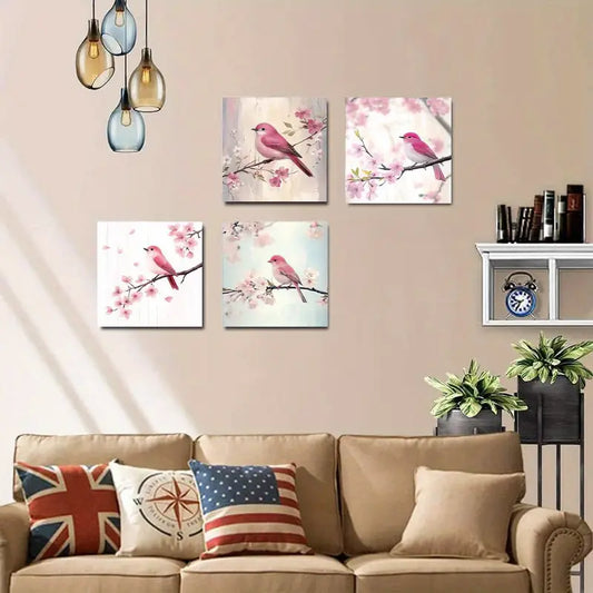 4pcs Bummingbirds on Branch Picture Print Pink Wall Art Canvas Framed