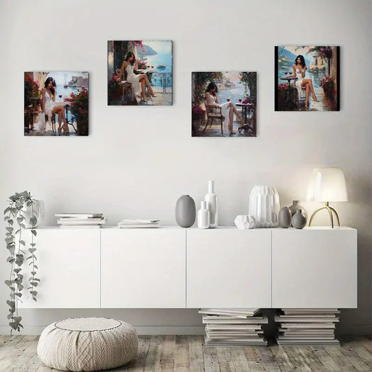 4pcs Coastal City Women Prints, Fashion Wall Art Canvas Framed