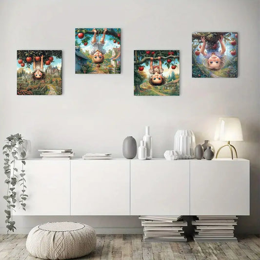 4pcs Girl Trunk Apple Bird Picture Wall Art Canvas Framed