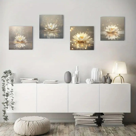 4pcs Elegant Golden For Lotus Wall Art Canvas Framed