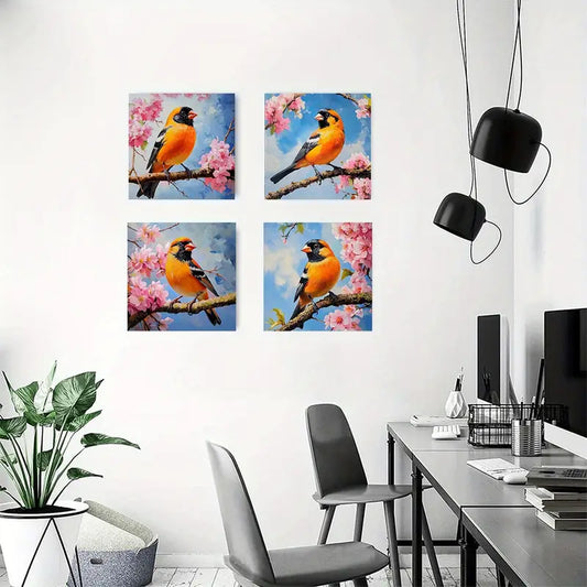 4pcs Colorful Birds Sitting on Tree Branch RT Wall Art Canvas Framed